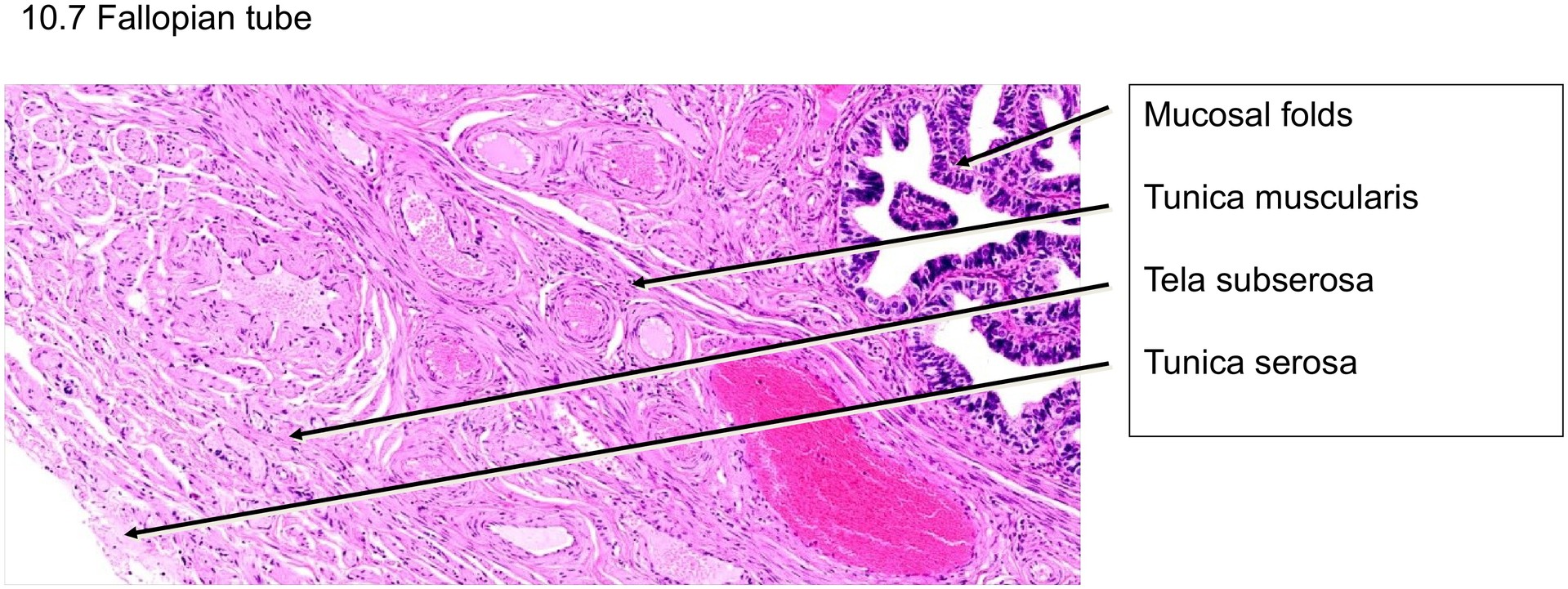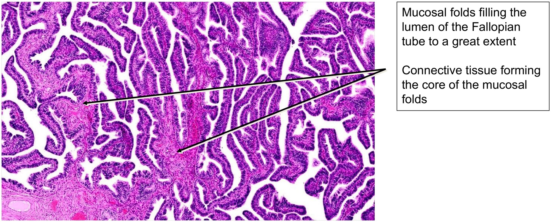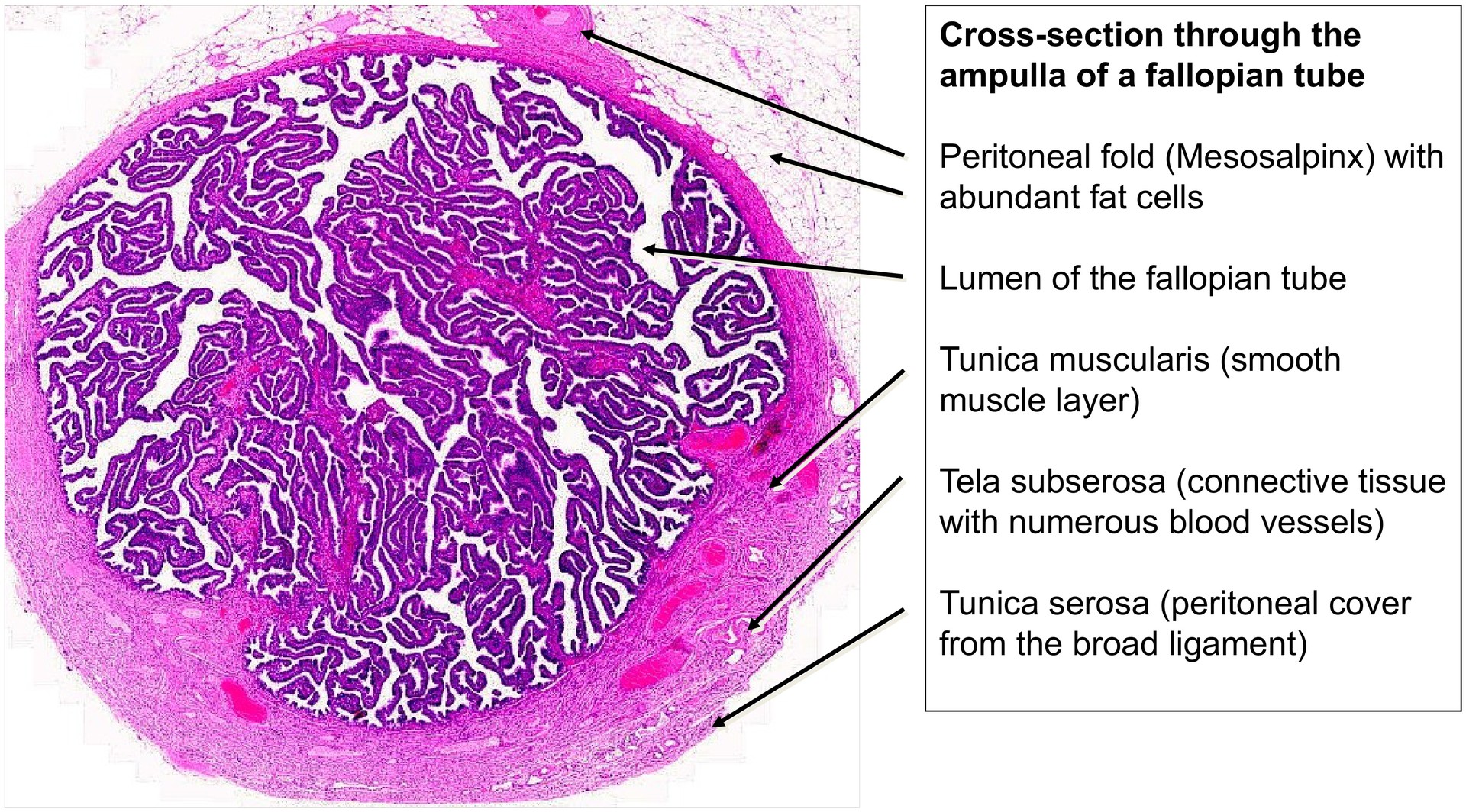 Routine histological section of the fallopian tube, stained with the general overview stain H&E. The specimen includes both the infundibulum and ampulla.
