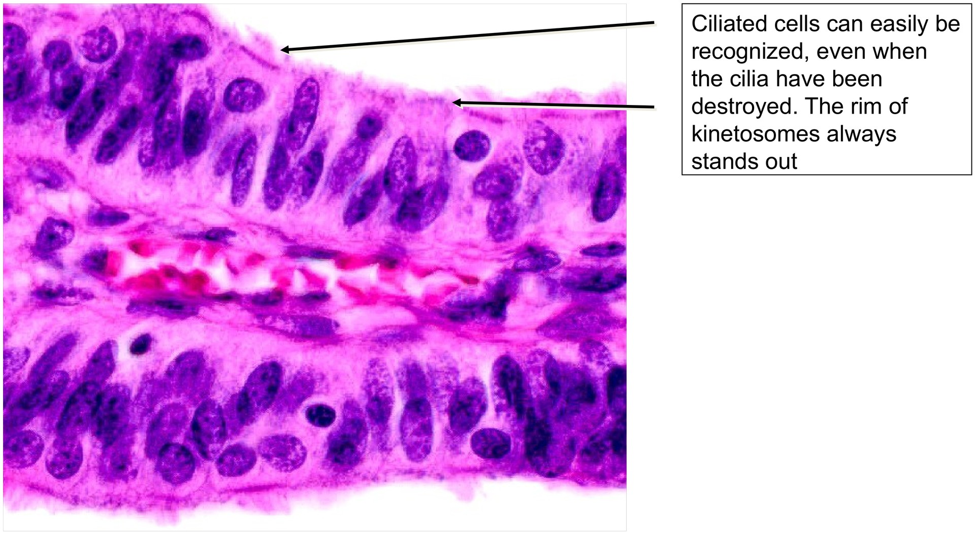 These cell types can be distinguished by nuclear shape even where the cilia are not clearly visible.