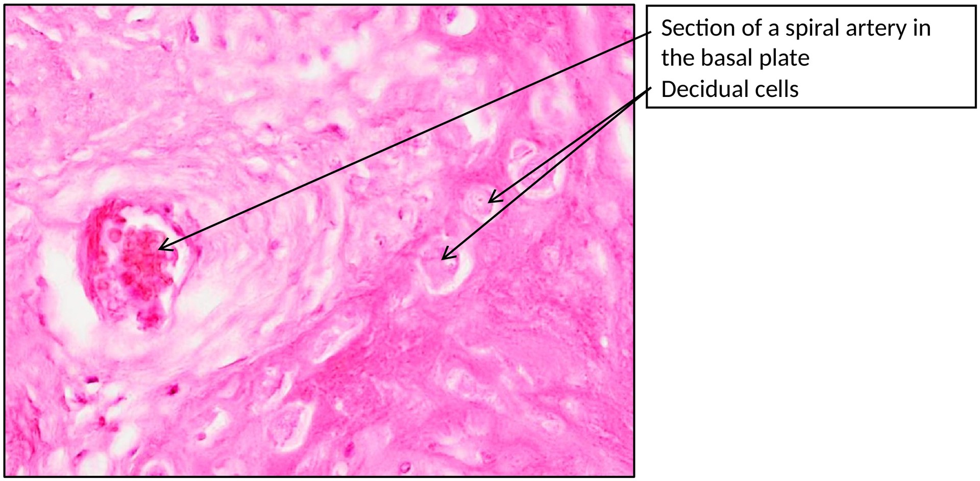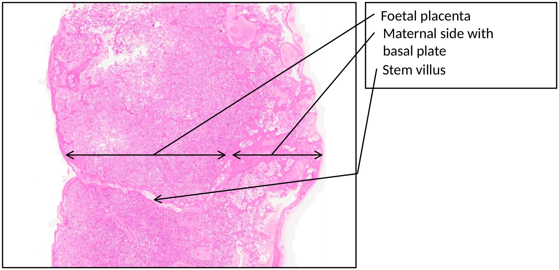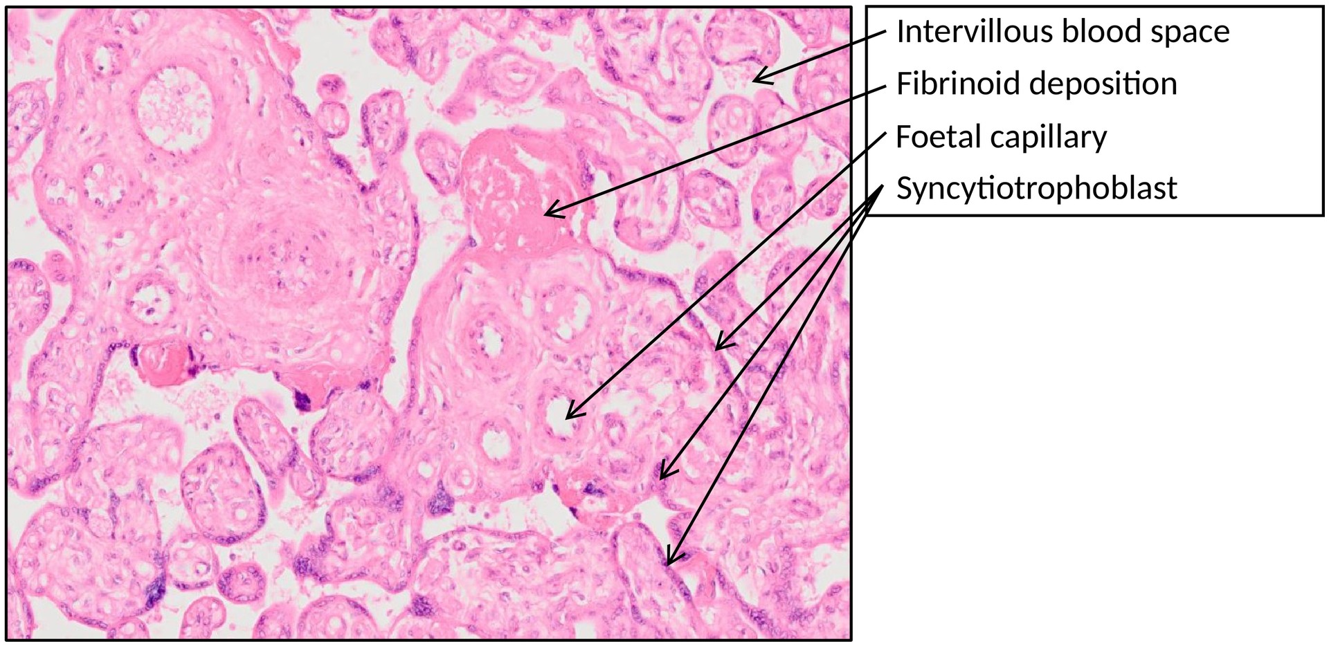 Histological section of a mature human placenta, prepared with standard H&E staining for general tissue structure.