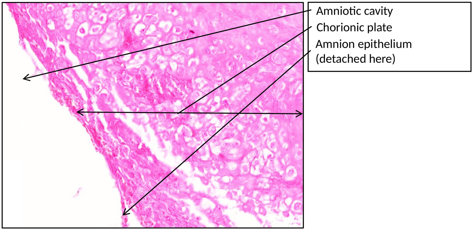 Locate the amniotic epithelium and the chorionic plate on the fetal side.