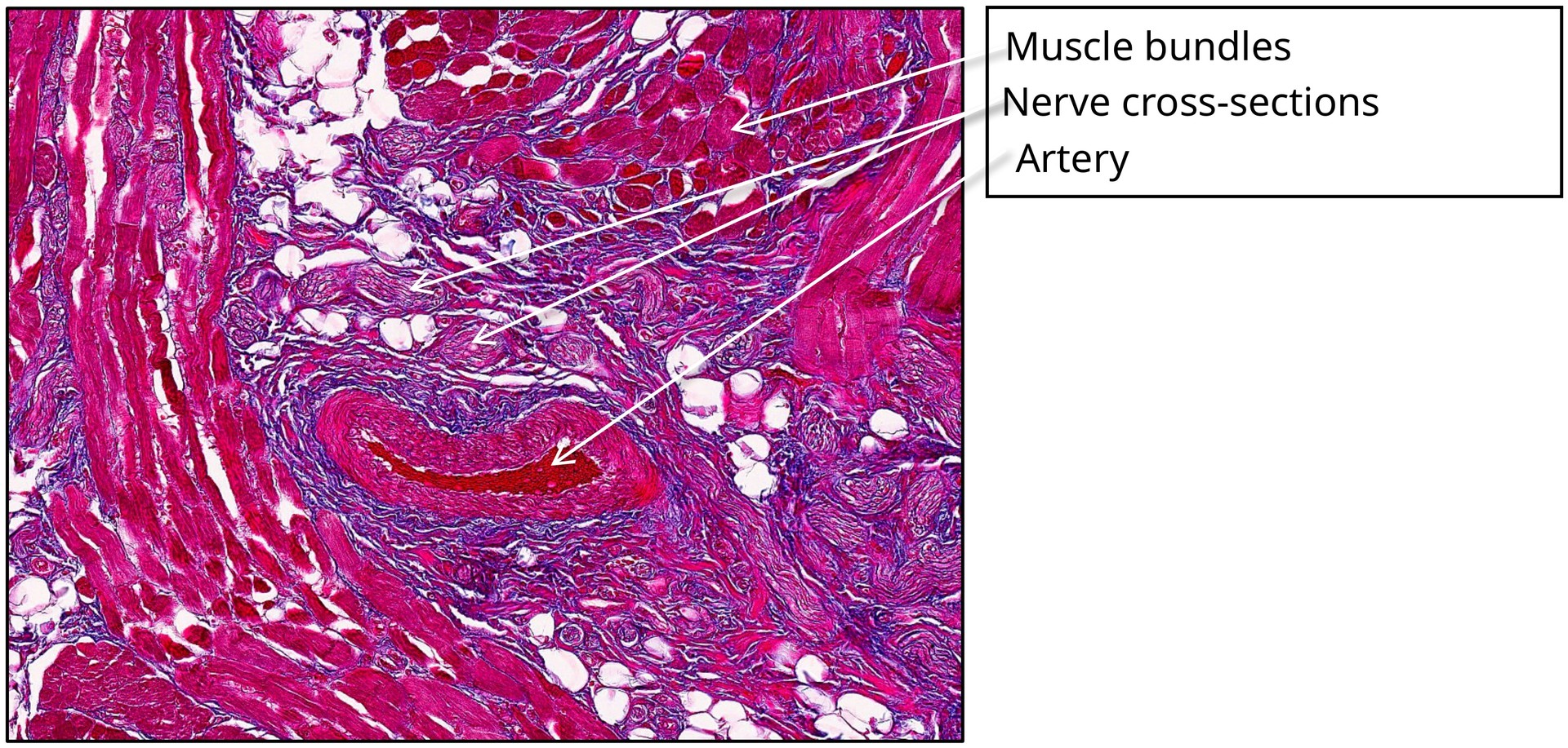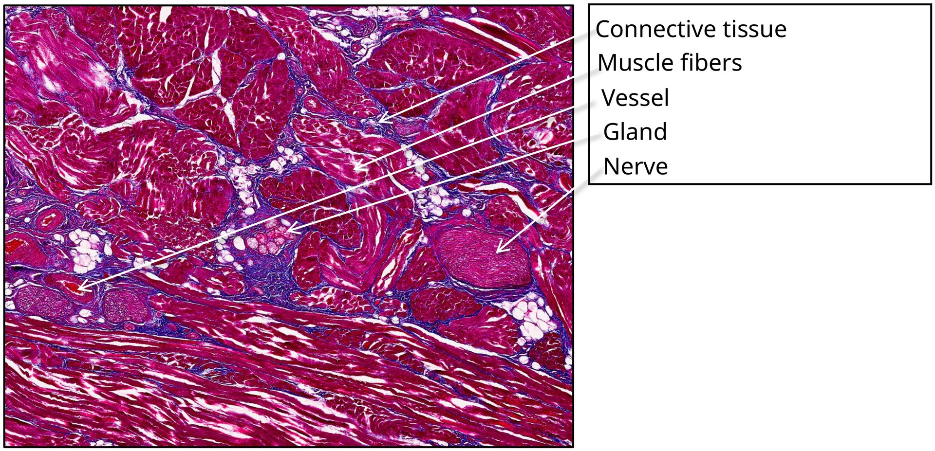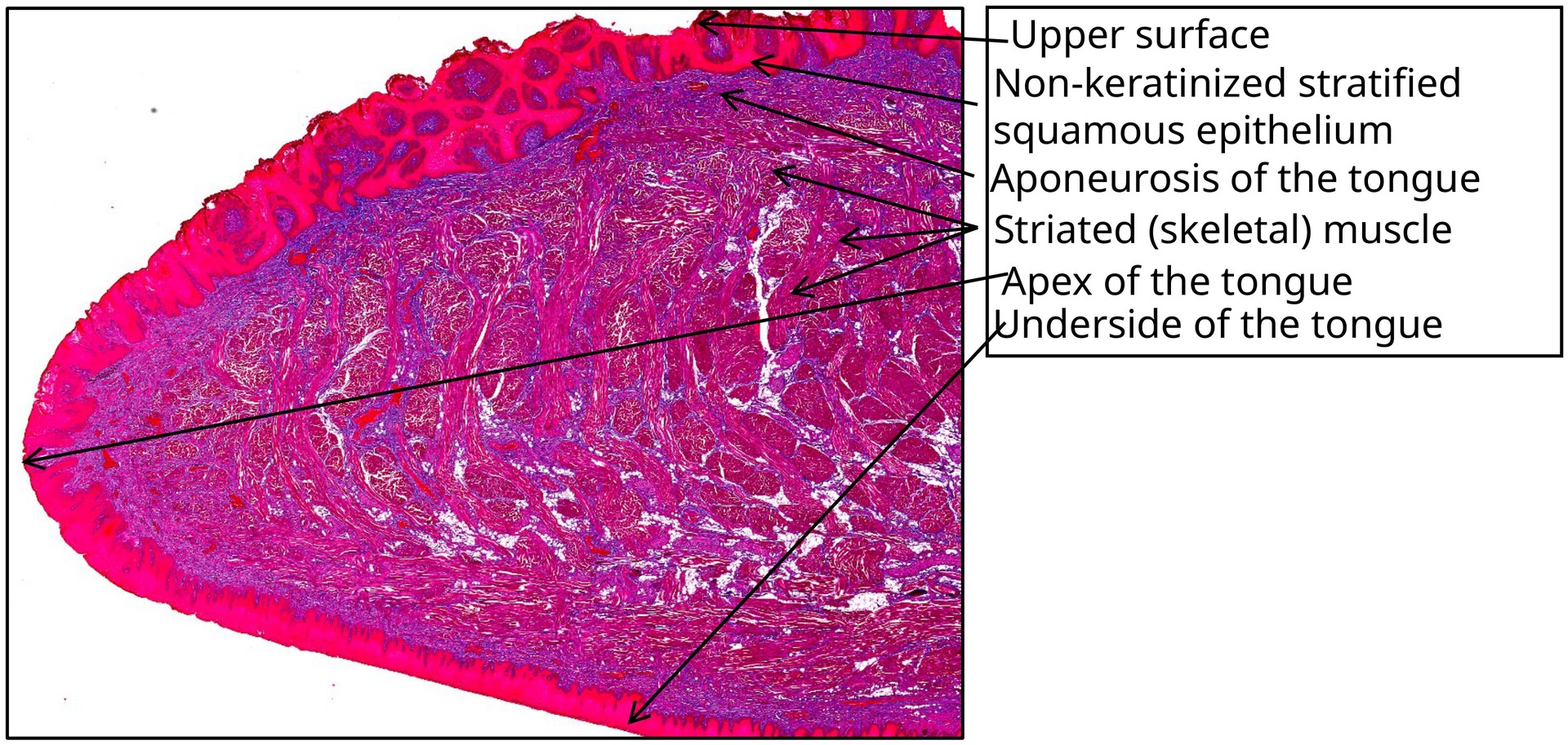 - Observe the lingual aponeurosis, striated muscle fibers, blood vessels, and nerves.